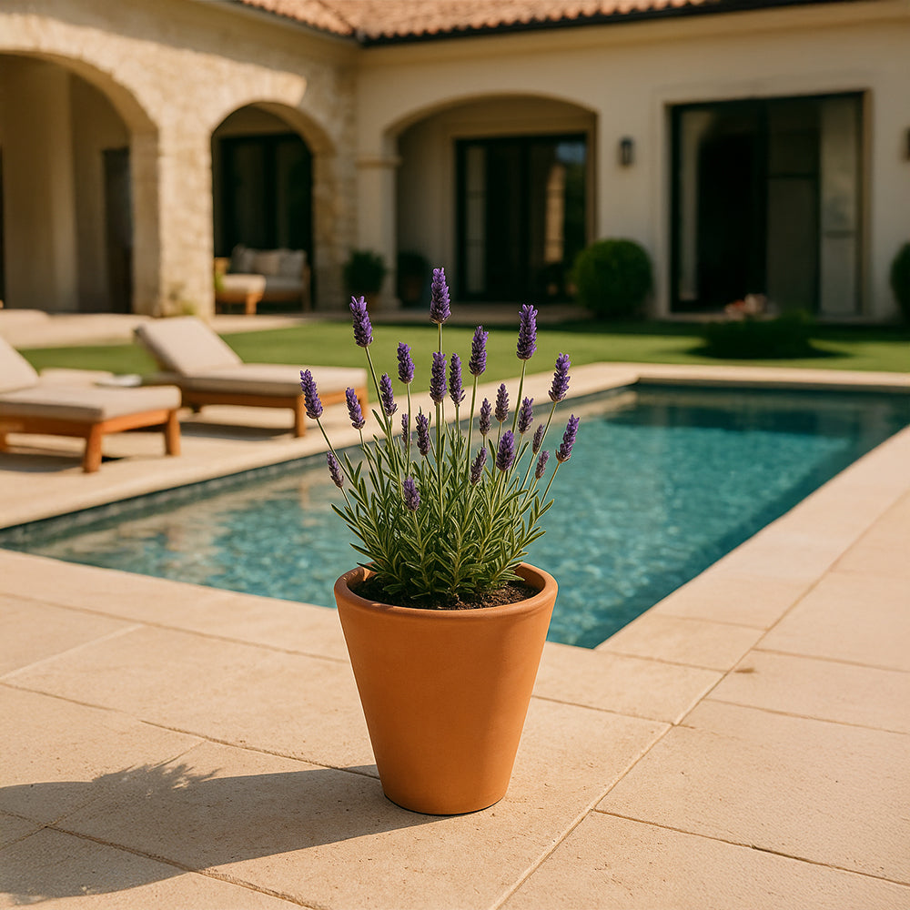 The handmade Catania terracotta planter features a tall, tapered design that adds visual height without taking up excess space. Available in Small, Medium, Large, and X-Large, it’s perfect for herbs, succulents, or accent plants with minimal root depth. Crafted from breathable terracotta, it brings warmth to patios, window corners, or entryways.