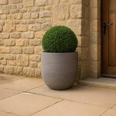 Handcrafted with a sleek ribbed texture, this gray ceramic decorative planter brings a clean, modern look to outdoor and indoor settings. Its rounded form and matte finish make it a versatile fit for contemporary patios, entryways, or garden spaces. Ideal for use as a large outdoor planter, it effortlessly complements shrubs, flowers, or topiaries with minimal yet stylish presence.