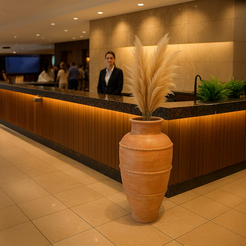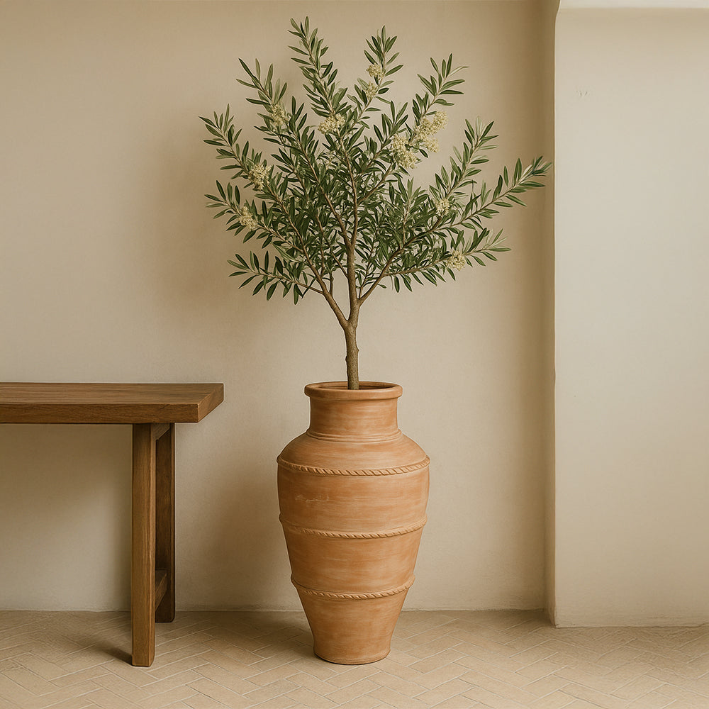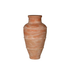 Triple rope-like bands wrap this handmade terracotta garden planter, creating a classic and Mediterranean-inspired silhouette. The large, tapered form is ideal for patios, entryways, or garden corners needing a bold focal point. Its porous clay structure encourages healthy plant growth while offering a natural, rustic appeal. A standout choice among large outdoor planters with decorative charm.
