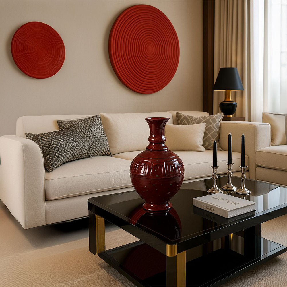 Diese dekorative Keramikvase in Burgunderrot besticht durch ihre traditionelle Form mit erhabenen, griechisch inspirierten Motiven und dezenten Sprenkeln. Der satte Burgunderton und die hochglänzende Oberfläche verleihen jedem Raum Tiefe und Struktur. Handgefertigt von erfahrenen Kunsthandwerkern, bietet sie eine zeitlose Ästhetik und wirkt sowohl als Einzelstück als auch in Kombination mit anderen klassischen Vasen auf Kaminsimsen, Konsolen oder Beistelltischen im Eingangsbereich wunderschön.
