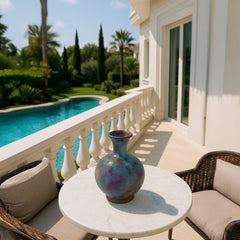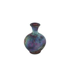 Die runde Keramikvase Celestia im Raku-Stil besticht durch ein faszinierendes Zusammenspiel von Violett-, Blau- und Kupfertönen – erzielt durch die traditionelle Raku-Brenntechnik. Jede Vase ist sorgfältig handgefertigt und hat mit ihren subtilen Farb- und Texturvariationen ihren ganz eigenen Charakter. Ihre voluminöse, runde Form verleiht jedem Interieur Wärme und Gemütlichkeit und eignet sich perfekt für dekorative Regale oder als ausdrucksstarker Blickfang auf dem Tisch.