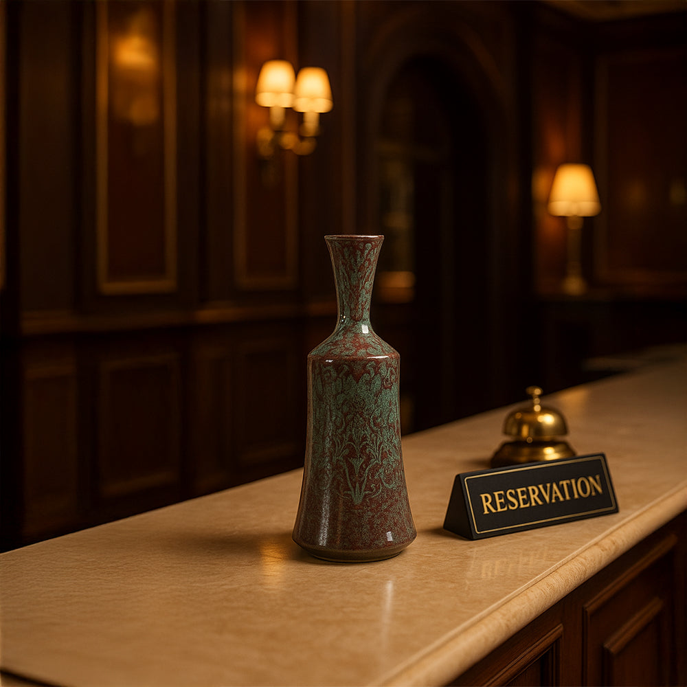 Diese hohe, dekorative Keramikvase in Bordeauxrot und Grün besticht durch ihre markante Farbkombination aus Bordeauxrot und Grün mit einer marmorierten Glasur, die an Naturstein erinnert. Die hohe, ausgestellte Silhouette und der schmale Hals verleihen ihr eine elegante Form, die sich ideal als Solitärvase oder in Kombination mit Trockenblumen eignet. Die handgefertigte Vase mit glänzender Oberfläche ist ein ausdrucksstarkes Dekorationselement für moderne, eklektische oder rustikale Einrichtungen.