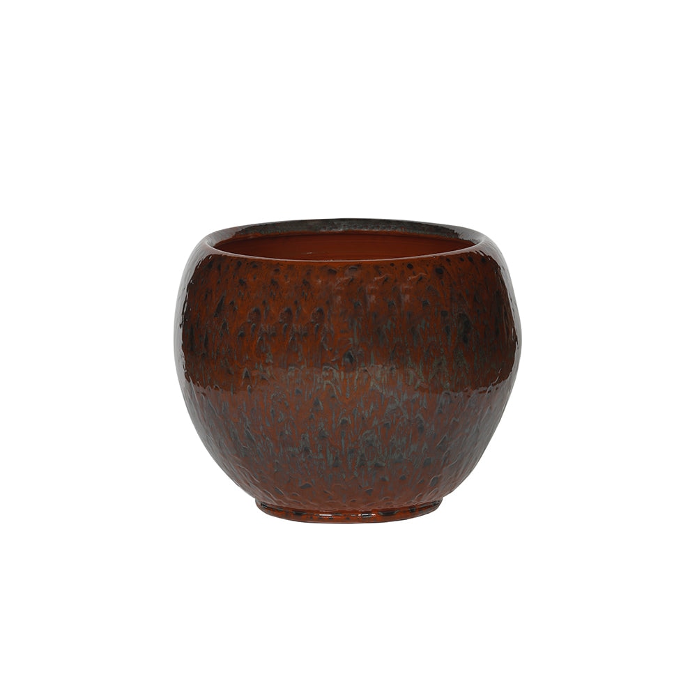 Der handgefertigte Keramik-Blumentopf „Obsidian Lava“ besticht durch seine kompakte Form, die ausdrucksstarke Vulkanglasur und die skulpturale Gestalt. Erhältlich in den Größen Klein, Mittel und Groß, eignet er sich perfekt für Sukkulenten oder Kräuter auf Fensterbänken oder Schreibtischen. Die tiefrote, reaktive Oberfläche macht ihn zu einem markanten Blickfang in modernen Interieurs.
