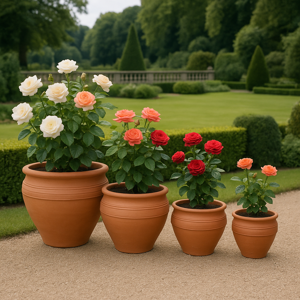 Set aus gerippten, runden Terrakotta-Blumentöpfen