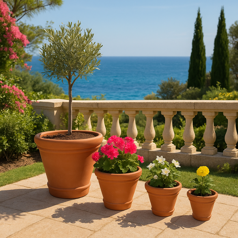 Diese sorgfältig handgefertigten, konisch zulaufenden Terrakotta-Blumentöpfe verleihen Garten und Terrasse eine elegante Note. Die sanft nach unten verjüngende Form und der breite Rand sorgen für ein klassisches und zugleich funktionales Design, das Luftzirkulation und Wasserabfluss optimiert. Das Terrakotta-Pflanzgefäß-Set eignet sich perfekt für Kräuter und Zierpflanzen und schafft natürliche, erdige Arrangements im Freien oder auf sonnigen Fensterbänken.