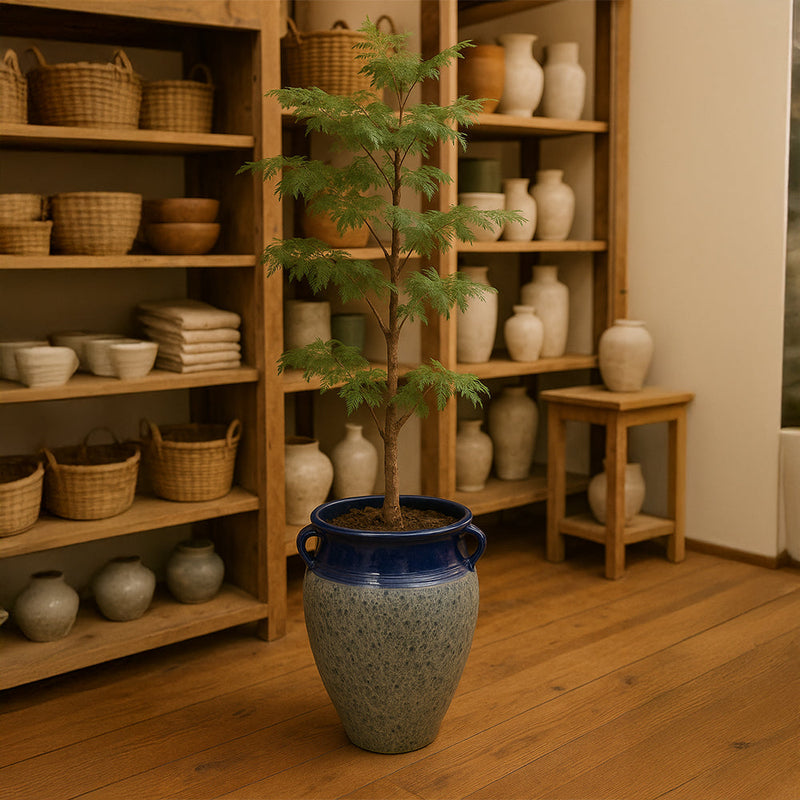 Maceta decorativa de cerámica con ánfora azul