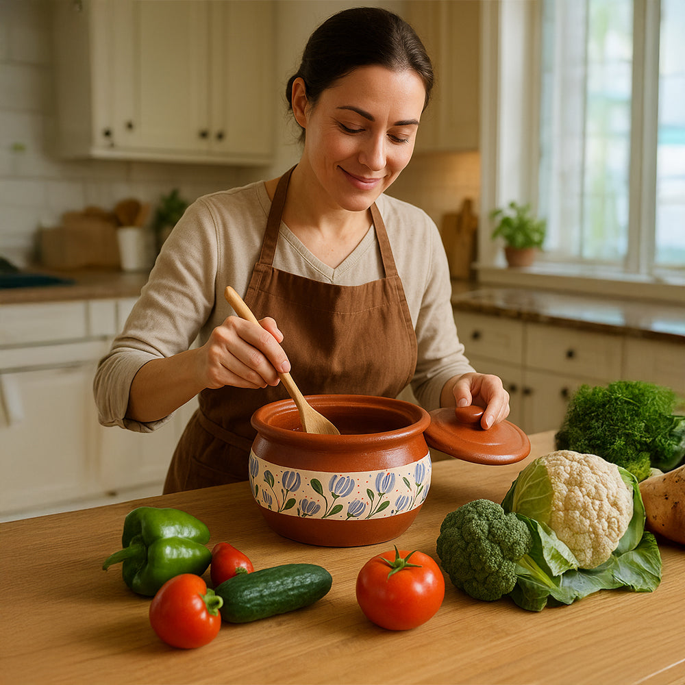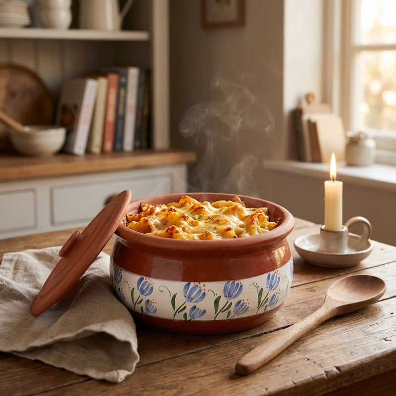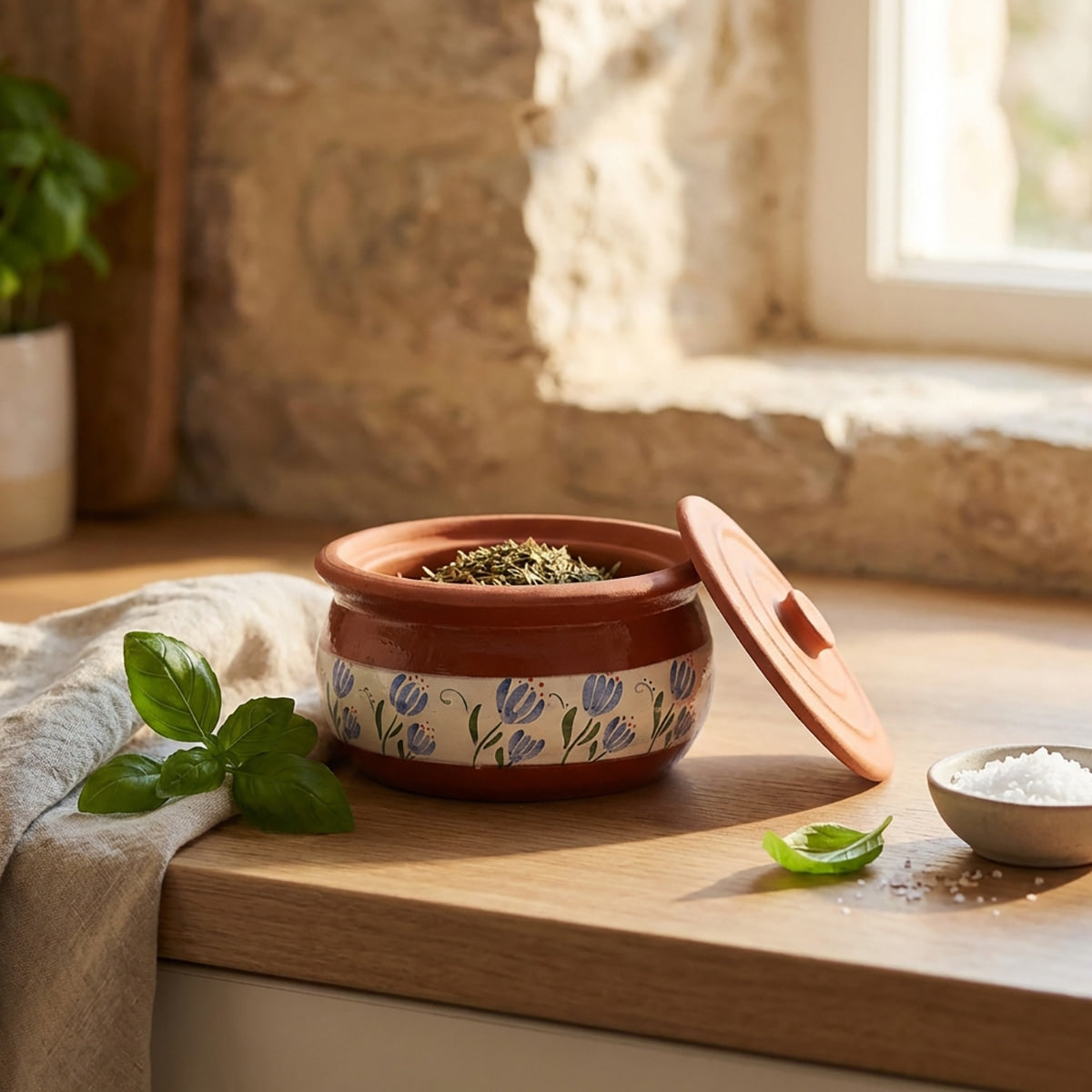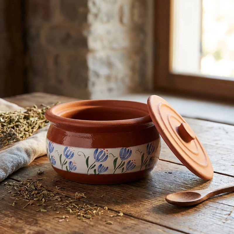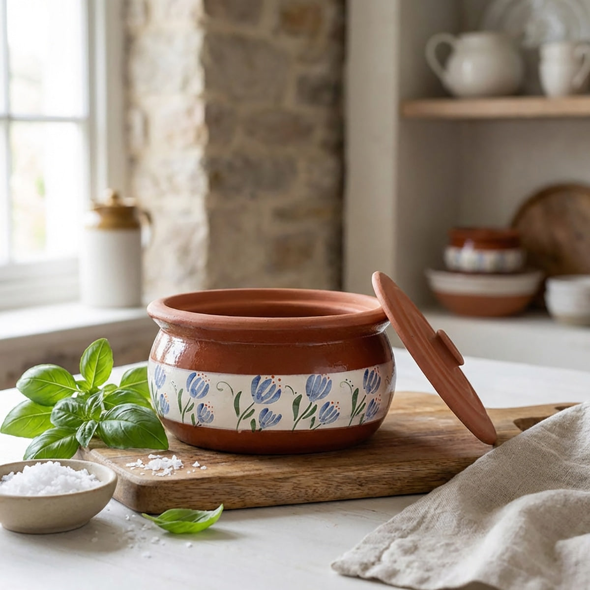 Esta olla de terracota hecha a mano presenta un delicado diseño floral de tulipanes azules inspirado en motivos mediterráneos, que añade un toque artesanal a cualquier cocina. Disponible en tamaños pequeño, mediano y grande, es perfecta para todo, desde guisos individuales y guarniciones hasta sustanciosas comidas horneadas. Su cuerpo rústico de arcilla promueve una distribución uniforme del calor y una excelente retención de humedad, realzando el sabor y la textura de cada receta. Decorativa y funcional, se adapta perfectamente del horno a la mesa para una presentación cálida y acogedora.