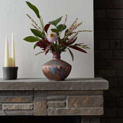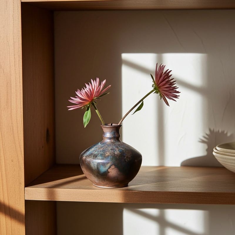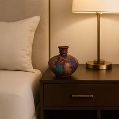 El jarrón decorativo de cerámica Raku Nebulosa de Cobre exhibe un remolino cósmico de cobre iridiscente, verde azulado y magenta, creado mediante técnicas tradicionales de cocción Raku. Cada pieza artesanal es única, con crepitaciones espontáneas y texturas ahumadas que evocan la belleza de la transformación natural. Su forma ancha y redondeada ofrece equilibrio visual, convirtiéndolo en una pieza central impactante para cualquier estantería, consola o entrada.