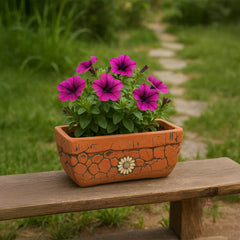 Hecha a mano en terracota con un acabado rústico craquelado, esta maceta rectangular para exterior presenta un motivo de margaritas en relieve que le aporta un toque vintage. Su forma alargada la hace ideal para barandillas de balcones, alféizares de ventanas o terrazas. Perfecta para hierbas aromáticas, plantas con flores o vegetación de temporada, combina detalles decorativos con una textura terrosa, ofreciendo un toque atemporal para espacios inspirados en el jardín.