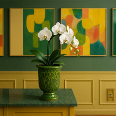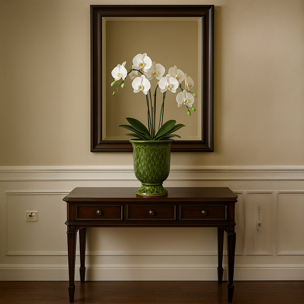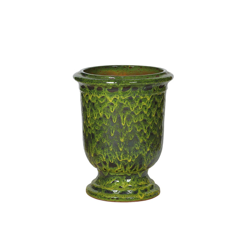 El brillante esmalte verde y la forma tradicional Vanduze se unen en esta maceta decorativa de cerámica hecha a mano. Su silueta atemporal aporta elegancia a consolas, repisas o interiores de estilo jardín. La vibrante superficie realza la profundidad del color, mientras que las sutiles irregularidades del proceso artesanal hacen que cada pieza sea única. Una hermosa manera de exhibir flores o plantas secas con un toque de refinamiento artesanal.