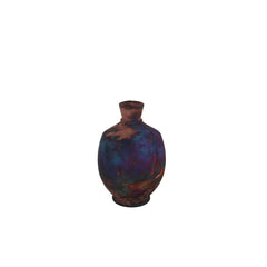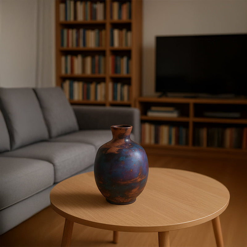 El jarrón decorativo de cerámica de cuello estrecho Indigo Raku presenta una fascinante mezcla de azules profundos, rojos quemados y púrpuras ahumados, logrados mediante la cocción tradicional en Raku. Con su cuello estrecho y ligeramente cónico y su acabado orgánico, cada jarrón es una expresión única de artesanía. Ideal para interiores modernos y eclécticos, esta pieza aporta una belleza natural y elemental a cualquier mesa o estante.