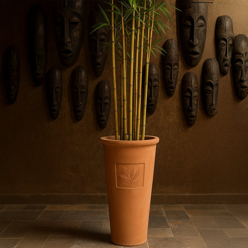 La maceta decorativa alta de terracota con hojas en relieve ofrece un encanto atemporal gracias a su forma estilizada y textura de arcilla natural. El diseño de hojas en relieve añade un toque botánico a su silueta artesanal, lo que la hace ideal para entradas, patios o rincones interiores. Esta maceta alta, elaborada en terracota rústica, aporta calidez y elegancia artesanal a cualquier espacio, a la vez que realza su vegetación favorita con un estilo sobrio.