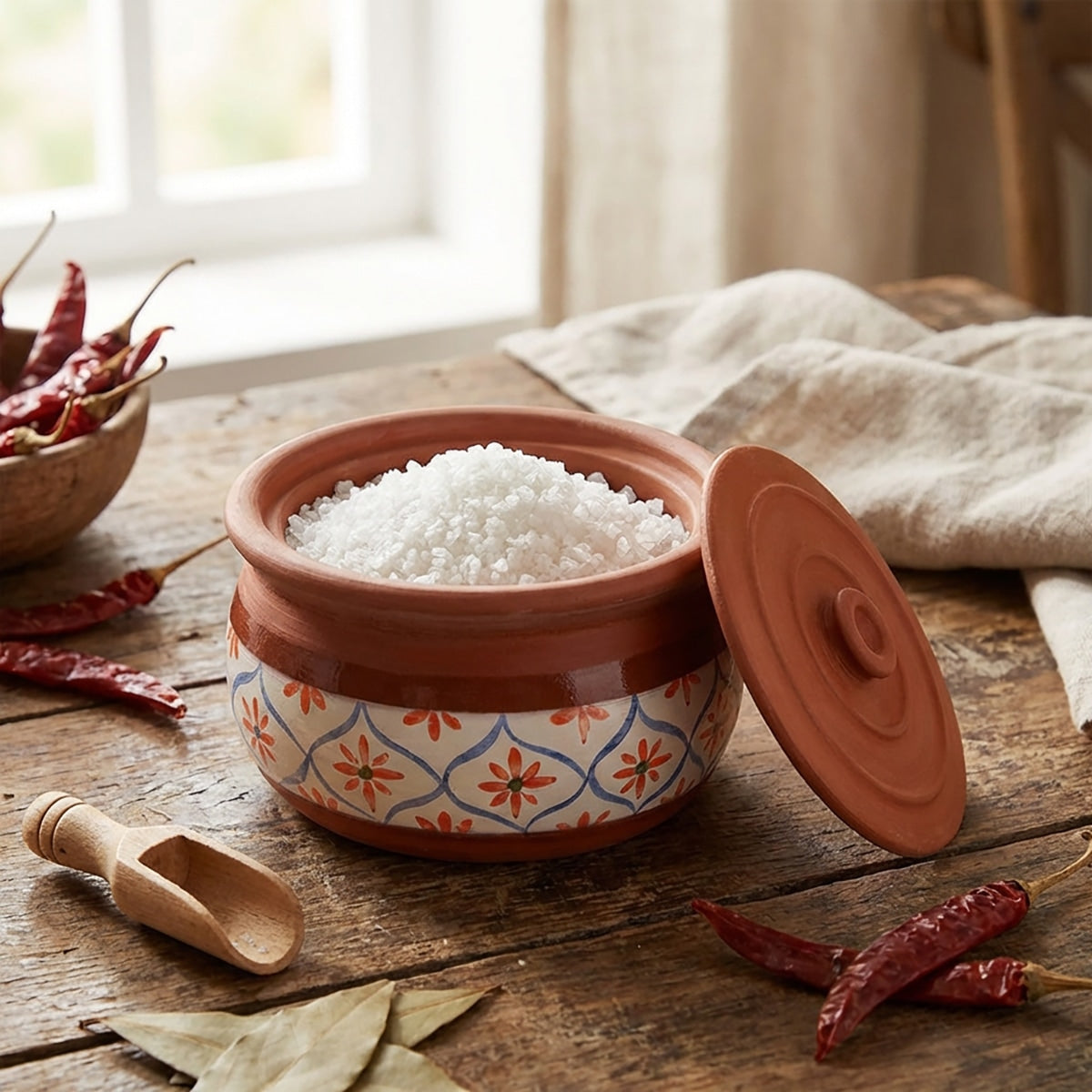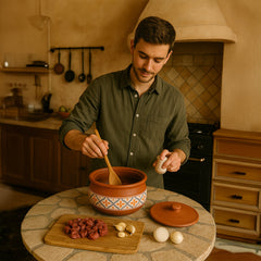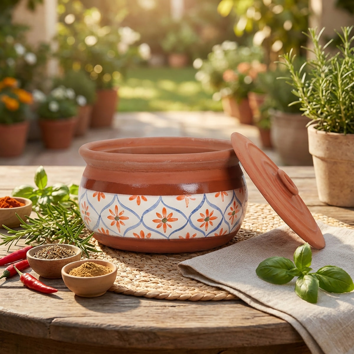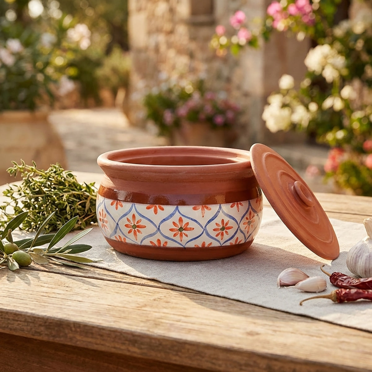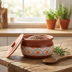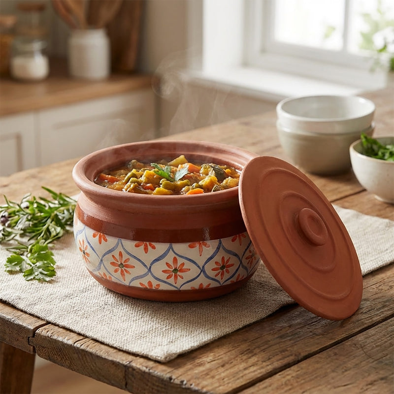 Esta olla de terracota hecha a mano, adornada con un diseño floral mediterráneo, es perfecta para preparar desde raciones individuales hasta guisos familiares, sopas, estofados y otros platos de barro. Disponible en tamaños pequeño, mediano y grande, cada olla ofrece una distribución natural del calor a base de arcilla para retener la humedad y el sabor, mientras que la tapa rústica conserva el aroma y la calidez. Ideal tanto para cocinas rústicas como contemporáneas, se adapta a la perfección del horno a la mesa para servir con estilo.