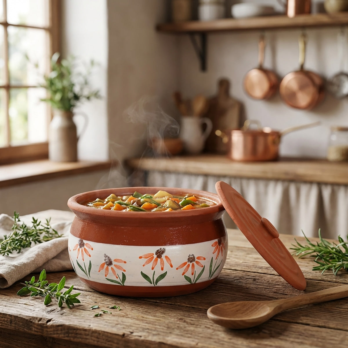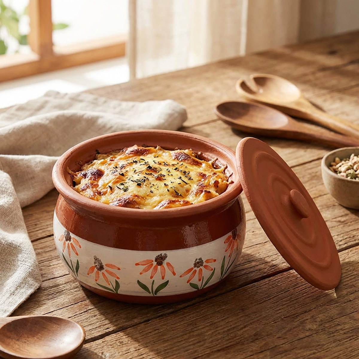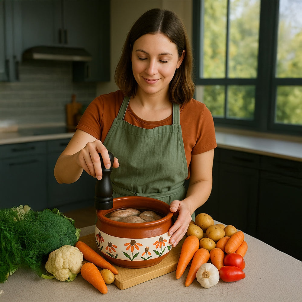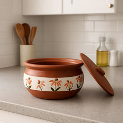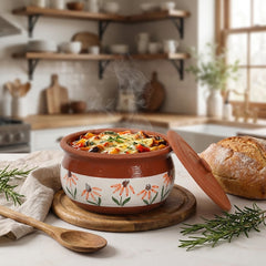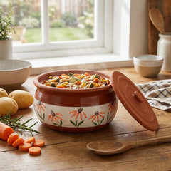 Esta maceta de terracota hecha a mano presenta diseños florales de inspiración mediterránea, que aportan encanto a cualquier cocina. Disponible en tamaños pequeño, mediano y grande, es ideal para guisos, guarniciones o platos horneados. La terracota natural garantiza una suave retención del calor y la humedad, lo que la hace decorativa y práctica para usarla del horno a la mesa.