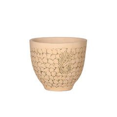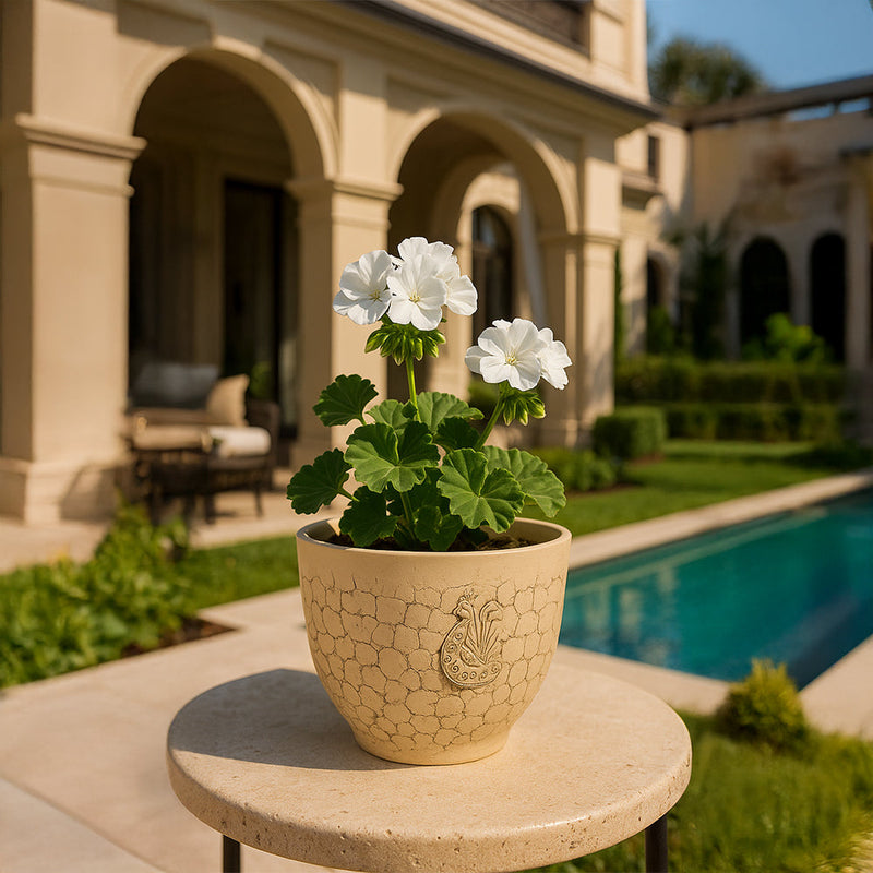 La maceta de exterior de terracota texturizada color crema pavo real añade un toque refinado y artesanal a patios o rincones de jardín. Con su medallón de pavo real en relieve, su superficie en tonos crema y su textura terrosa, combina la elegancia clásica con un carácter rústico. Ideal para realzar la decoración de plantas, cada pieza artesanal presenta sutiles variaciones que celebran la calidad artesanal y el estilo atemporal para exteriores.