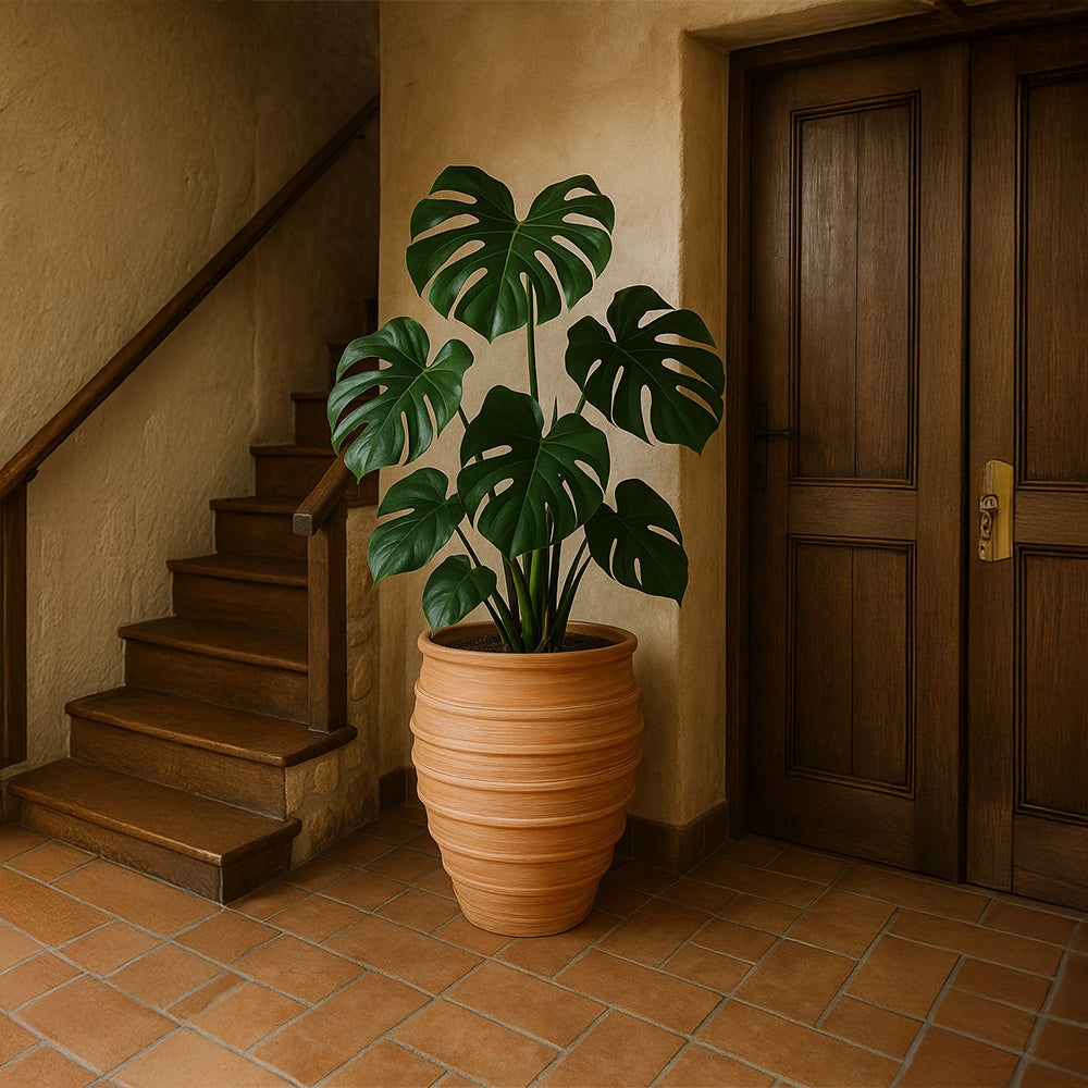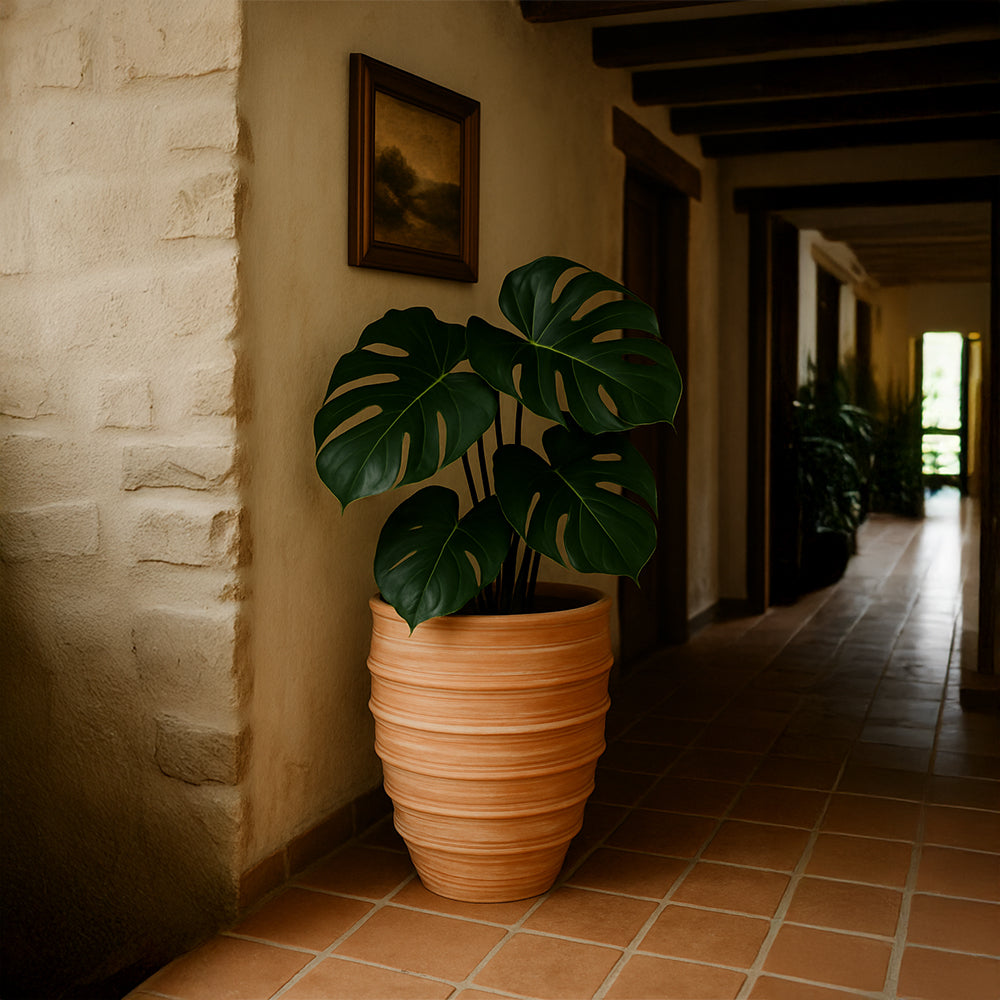 La maceta decorativa de terracota con forma de rayas destaca por su superficie estriada natural y su color terroso. Su cuerpo artesanal crea una textura cálida y rústica, perfecta para plantas de interior y exterior. Su acabado orgánico a rayas aporta un toque de profundidad y arte, convirtiéndola en una encantadora adición a patios, entradas o interiores acogedores. Al ser una maceta de terracota hecha a mano, es funcional y atemporal.