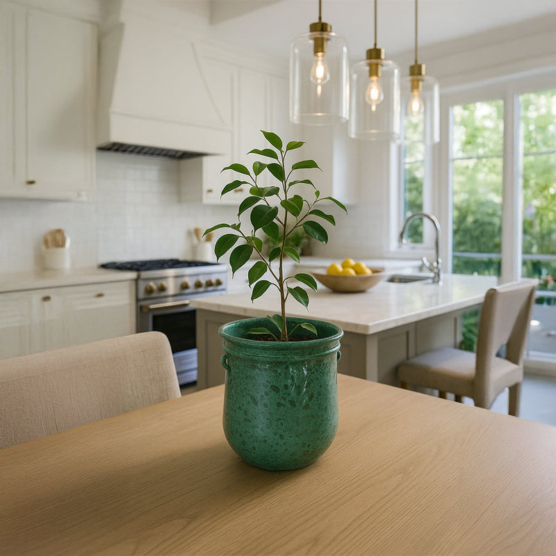 Hecha a mano con un acabado verde envejecido, la maceta de cerámica Verdigris Patina evoca la belleza del cobre envejecido y la vajilla de jardín antigua. Su esmaltado texturizado y sus sutiles variaciones tonales aportan una elegancia rústica a estanterías interiores o rincones exteriores. Perfecta para hierbas, flores o plantas colgantes, su robusta forma de cerámica favorece el crecimiento saludable de las raíces y sirve también como elemento decorativo en ambientes clásicos y contemporáneos.