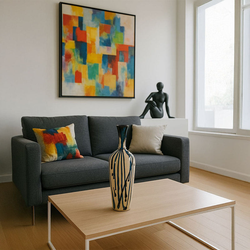 Blue Drip Beige Ceramic Decorative Vase features a hand-applied drip glaze that flows from deep blue to earthy beige. The tall, elegant form and artistic surface create a visually dynamic accent for console tables, dining room buffets, or mantelpieces. Skillfully handmade, each vase is unique in texture and tone—bringing organic charm and bold design into modern and eclectic home settings.