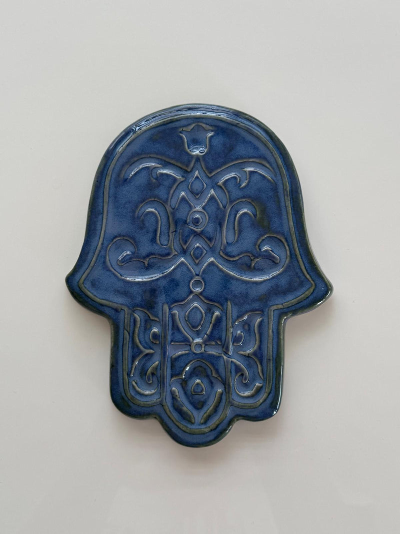 Handcrafted in rich blue ceramic, the Hamsa Hand wall art symbolizes protection, harmony, and good fortune. With its spiritual significance and detailed design, it serves as a meaningful decorative piece for any space. Ideal for entryways, meditation rooms, or accent walls, the handmade nature of each piece ensures subtle variations that add to its authenticity and charm. A timeless blend of tradition and artistry.
