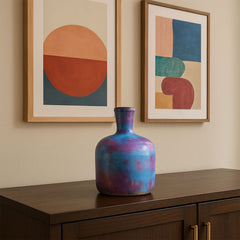 Iridescent Raku Short Neck Ceramic Decorative Vase features a mesmerizing blend of blue, pink, gold, and smoky copper tones. Created using traditional Raku firing techniques, each handmade piece showcases organic surface variations and unpredictable crackle effects. Its low, rounded form and artistic finish make it a striking accent in contemporary or eclectic interiors. A true fusion of craft and fire-transformed beauty.