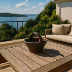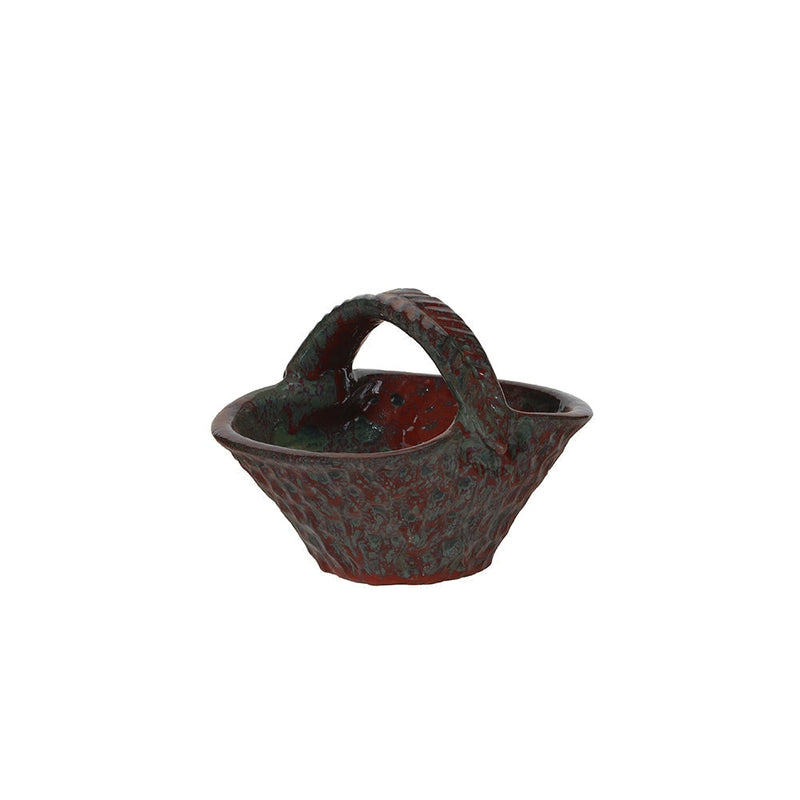 This handmade ceramic basket features a rustic red-green glaze and textured surface, adding artisanal charm to any space. Available in Small, Medium, and Large, it’s perfect for holding trinkets, wrapped candy, or dried herbs. A compact yet eye-catching accent for rustic or farmhouse décor.